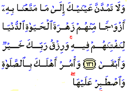ha Commentary: There is no reason why the artificial sheen of wealth and power should lure the believers. Whatever little they earn as a result of their sweat and toil is much better for honest and righteous people since it leads to their good in both worlds - the present and the next. The Prayer: a mean to change the perspective on life The believers are told to enjoin prayer on their household. This is likely to change their children's perspective on life, their values, and the focus of their attentions; a change that will make them satisfied with their lawfully earned livelihood, even if it be meagre. This will lead them to prefer a virtuous life ensuing from faith and godliness over a life of luxury and self-indulgence arising out of sin, disobedience and excessive worldliness. [Compiled from "Towards Understanding the Quran" by Sayyid Abul Ala Mawdudi, p. 243] |