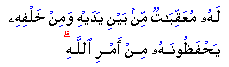The interpreter of the Quran, Ibn Abbas, has explained that the word Al-Mu'aqqibat (translated here as "angels in succession") refers to the angels whom Allah appoints to guard a person from before and from behind. Then when the decree of Allah comes, which Allah wills should befall him, they withdraw from him. Mujahid said: "There is no person who does not have an angel appointed to protect him when he is asleep and when he is awake, from the jinn, other men and savage beasts. None of these come to him, but the angel tells it, 'Keep away!' except for that which Allah has given permission to befall him." A man said to Ali ibn Abu Talib, "A group from Murad want to kill you." He said, "With every man there are angels guarding him from whatever has not been decreed for him. When the decree comes, they move away from him and let it reach him. Your fixed lifespan (decreed by Allah) is a protection for you." Source: |
