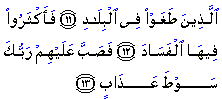 Corruption is an inevitable result of tyranny, and it affects the tyrant and his subjects alike. Indeed, tyranny ruins all human relations. It forces human life out of its healthy, constructive and straight path and diverts it into a line which does not lead to the fulfillment of man's role as God's vicegerent on earth. Tyranny makes the tyrant captive of his own desires because he is uncommitted to any principle or standard and unrestrained within any reasonable limit. Thus the tyrant is always the first to be corrupted by his own tyranny. He assumes for himself a role other than that of a servant of God, entrusted with a specific mission. This is evident in Pharaoh's boastful claim: "I am our supreme Lord." (79:24) Tyranny also corrupts the masses as it humiliates them and compels them to suppress their discontent and hatred. It kills all human dignity and wastes all creative talents, which cannot flourish except in an atmosphere of freedom. A humiliated soul inevitably rots away and becomes a breeding ground for sickly desires. Hence, digression from the right path becomes the order of the day as clear vision becomes an impossibility. In such conditions no aspiration to a higher standard can be entertained. The net result of all this is the spread of corruption. Tyranny also destroys all healthy standards and concepts because they constitute a threat to its existence. Hence, values are falsified and standards are distorted so that the repulsive idea of despotism becomes acceptable as natural. This, in itself, is great corruption. When these aforementioned peoples caused such corruption, the remedy was, inevitably, a complete purge. God is certainly aware of their deeds and He records them all. So, when corruption is increased, He severely punished the corrupt. The text connotes that the punishment was very painful as it uses the term 'scourge', or 'whip' as the Arabic term literally means, and that it was in large supply as indicated by use of the phrase 'let loose'. Thus the tyrants were made to suffer a plentiful and painful retribution. Source: |