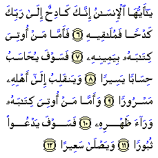 Man certainly labours hard in this life, shouldering his responsibilities and exerting himself. All this he does in order to return, in the end, like all the rest of creation, to Allah. Man labours even for what he enjoys! Nothing in this life comes easily or without effort: if sometimes no physical labour is needed, then surely some mental and emotional effort will be required. In this the rich and poor are alike, although the labour exerted may differ in kind and form. This address reminds man that labouring hard, in a variety of ways, is the lot of all in this life on earth. But when men meet their Lord, they will fall into two groups: one will suffer hardship incomparable to that suffered on earth; another consisting of those who have demonstrated their obedience and true submission, will enjoy the blessings of a rest in which the suffering of this life will be forgotten. He who is given his book in his right hand is the happy one who was true to his faith. Allah is pleased with him and rewards him well. He will have a lenient reckoning, that is to say that he will not be called to account for what he did in his life (Bukhari, Muslim, at Tirmidhi, an Nasai). He shall win "and return rejoicing tohis people", who will also have won and arrived in heaven ahead of him. We deduce from this statement that those who accept the faith in this life and adhere to the right path will gather together in heaven. Everyone ends up with those whom he loves and enjoys their company. We also have an image of the winner's all-important test: he returns with his face overflowing with happiness. This image is the extreme opposite of what happens to the afflicted who has to account for his evil deeds and receives his book with reluctance. But he who is given his book behind his back shall call down destruction upon himself and shall roast in the fire of Hell. The Quran usually makes a distinction between receiving the book with one's right hand or left hand. Here we have a new image: the book is given from behind the back. There is no reason to prevent the combination of anyone being given the book in his left hand and from behind his back at the same time. It is an image of one who feels great shame and hates to be confronted with what he has done. We have no real knowledge of the nature of this book or how it is given in one's right or left hand or behind one's back. But we comprehend from the first expression the reality of escape and from the second the reality of doom. This is indeed what we are meant to appreciate. The various forms of expression are used mainly to drive the point to us and to enhance its effects. The exact knowledge of what will happen and how it will happen belongs to Allah. Source: |