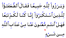 The textual term 'duafa' does not refer to those who were economically, socially or politically weak, rather, to those who were morally and intellectually so, and hence preferred to follow not their own, but other's opinions. The truly 'weak ones' are those who relinquished one of the most important qualities bestowed upon them by their Lord to others - the freedom to think, to believe and to choose a direction. The 'weak ones' preferred to follow the arrogant, the rebellious. They sought closeness to Allah's creations, in preference of Allah, opting to take religion from them instead of Him. Demonstration of weaknes is no excuse. It is a crime. Allah did not wish anyone to be weak. He invites the people to seek strength through Him - and all Might is His. Material strength, whatever its magnitude, is not enough by itself to enslave a people wishing to be free. It cannot imprison man's nobility. The most that brutal, material strength can do is to own bodies, which it can imprison, torture and punish. As for conscience, the soul and the intellect, no one can rob these things of another, unless the owner himself wishes to relinquish, in humiliation. The 'weak ones' are weak because there is weakness in their spirit, souls, and minds. Source: |