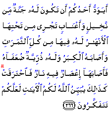 "Would any of you desire that he should have a garden of palms and vines with rivers flowing beneath - a garden in which he has every type of fruit - while the old age overtakes him and his offspring are too young or weak to look after themselves- and that it (the garden) should then be struck by a fiery whirlwind and be utterly burnt down? Thus does Allah make His Signs clear to you that you may reflect."