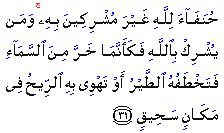 "Being true in faith to Allah, and never assigning partners to Him: if anyone assigns partners to Allah, he is as if he had fallen from heaven and been snatched up by birds, or the wind had swooped (like a bird on its prey) and thrown him into a far-distant place."