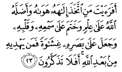 "Have you seen the kind of person who takes his own whims as his gods? God has left that one astray - sealing his hearing, veiling his heart and covering his sight. So who can now guide him after God (has withdrawn His support)? Won't you take a reminder?"