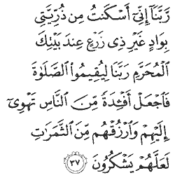 "Our Lord! I've settled some of my descendants in this barren valley next to Your Sacred House, so they can, our Lord, establish prayer. So make some people sympathetic towards them, and supply them with fruits so they can learn to be thankful."
