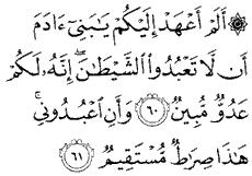 "Children of Adam, did I not command you not to serve Satan? He is to you an open enemy. And serve Me alone, this is the Straight Way."