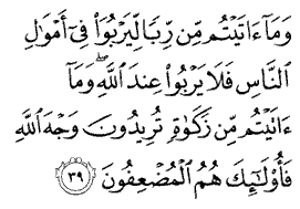 "Whatever you give to people in usurious hope that it may return to you increased through the goods of (other) people, will bring no increase in God's sight. Whereas whatever you give in charity seeking God's 'Face' (His approval and good pleasure), for those there is increase (of recompense) multiplied."