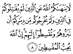 "God does not forbid you, with regard to those who did not fight you on account of religion and did not expel you from your homes, from treating them righteously and being just toward them. Truly God loves the just."